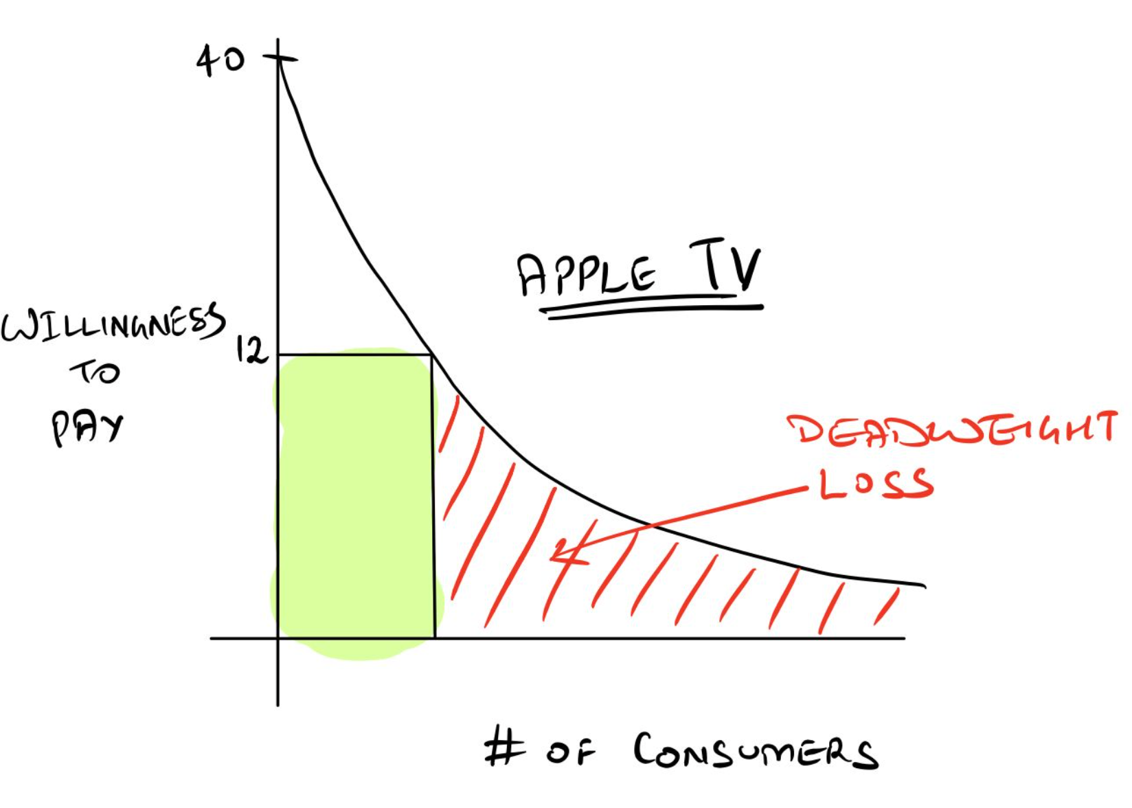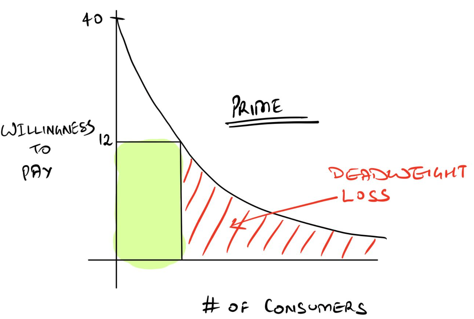Now, if you were to bundle both Prime and Apple TV, and sell them for $14 together, your total revenue would be $28. Assuming that buyers lie on different points on the x-axis, you can stack demand curves together by adding consumers' willingness to pay. So, $13 + $5 would be a 'willingness to pay' of $18 for both Prime + Apple TV. But, the consumer is getting both Prime + Apple TV for $14, which means that the consumer is saving $4 in a bundle, vs $1 in individual packs. The best part, though, is that you get access to a large consumer base, because as you add up the 'willingness to pay,' your demand curve becomes flatter.