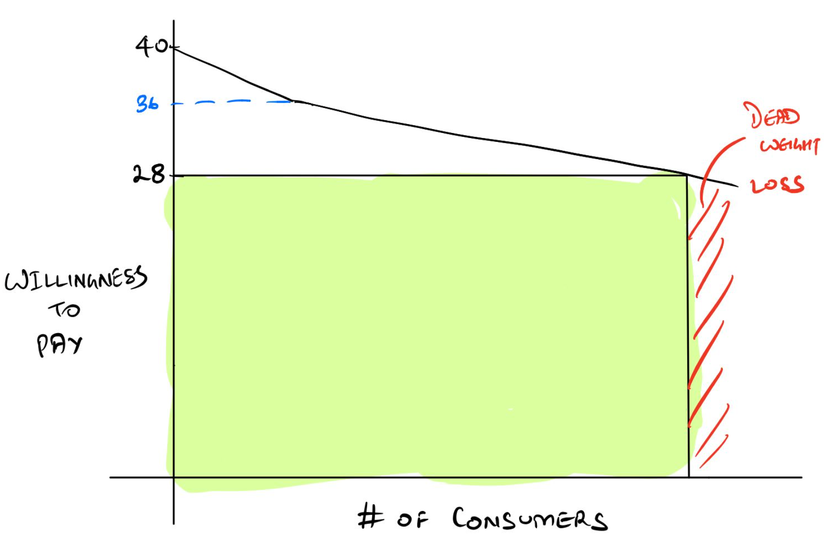 In the graphs below, as the 'willingness to pay reduces,' the number of consumers increases. (See demand curves.)